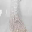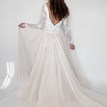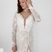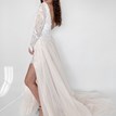 The Afina wedding model from the Katy Corso collection is incredibly feminine and chic! It has a romantic powder shade, accentuated by contrasting white lace applied throughout the length of the dress. The gown stands out with its graceful Mermaid silhouette, beautifully highlighting feminine curves. The bodice, adorned with pearls and transparent sequins, features a pointed neckline filled with nude tulle, a deep back neckline, and a sheer long sleeve with button details. A practical and shaping inner cup is also included. The bottom of the dress is a form-fitting skirt with a high, sexy slit and a detachable chapel train. The dress is overall very pleasant, truly soft and lightweight. It closes easily with a concealed zipper. The model also includes a gorgeous detachable train in the same powder shade, allowing you to style it according to your preferences. With this beautiful dress, you can feel not only feminine but also delicate and romantic :)