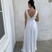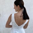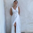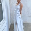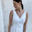 Beautiful romantic dress in a pure white shade features subtle V-necklines, a narrow waist, and a loose gathered skirt with a charming side slit. The inner layer is made of a comfortable elastic fabric, covered by a sheer white overlay that creates a soft romantic effect. Built-in cups beautifully shape the neckline, and the sheer ribbons can be tied to elegantly define the waist. It is entirely up to you how you tie them, we especially loved them styled into a bow. The label size is 34, but the dress also fits nicely a size 36. It is brand new and fastens at the back with a concealed zipper. Little flaw: a small hole on the neckline from the inner side of the dress.