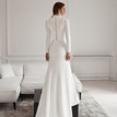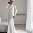 The Aisha wedding dress by Vissaria in a soft off-white shade is made for the bride who wants to feel elegant, feminine, and unforgettable. Crafted from stretchy fabric, it hugs the body in all the right places while staying comfortable throughout the day. The long sleeves with delicate lace and sparkling embellishments on the shoulders add a subtle touch of glamour. Even without a neckline, the sleek, form-fitting cut gives the dress a confident and sensual feel. Back buttons complete the refined look, while a short train with a finger loop makes walking effortless. A bold, timeless choice for the modern bride.