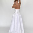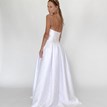 The Owidia wedding dress embodies modern elegance with a touch of uniqueness. Made from high-quality, structured satin, it holds its shape beautifully and looks luxurious at first glance. The straight, smooth corset perfectly adapts to the figure thanks to the adjustable lacing. The skirt features a softly voluminous effect with a built-in tulle underskirt, so there’s no need for a hoop. The satin base layer is covered with sheer tulle decorated with playful dotted embroidery. The overall design is completed with a thin ribbon belt. This wedding dress is completely new, created for a bride who loves clean lines and an unconventional style.