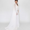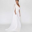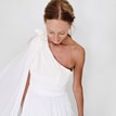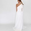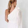 The Lia wedding dress is beautiful, airy, and light as a feather. Its base layer is made of a thicker lining covered with a sheer chiffon in a soft ivory shade. The dress stands out with its asymmetrical bodice design, featuring a single shoulder strap with a long shoulder drape adorned with larger 3D flowers at the top. This cut fits beautifully on a fuller bust. The dress has a raised waist accented with gathered chiffon and a flowy skirt perfect for twirling. It is completely new and fastens easily with a side zipper.