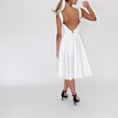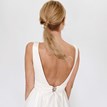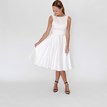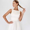 The simple short Susan dress is made entirely of matte satin in an ivory shade. It features a boat-neck bodice with a raised wide waistband, a deep back neckline, and a pleated skirt that falls just below the knees. It allows comfortable and graceful movement. The dress fastens with a combination of a zipper and a short tie, and has hidden side pockets. It also includes an external satin belt decorated with beads. Little flaw: there is a tiny pull on the bodice, invisible to the naked eye.
