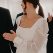 The stunning Sára wedding dress is minimalist, romantic, and beautifully feminine. It elegantly follows the body’s curves thanks to a refined trumpet silhouette that creates a graceful hourglass shape. The upper part features a fitted bodice with both front and back square necklines, complemented by airy sheer puff sleeves with cuffs. These fasten with three buttons, adding a lovely aesthetic detail. The waist is raised and gently cinched, flowing over fitted hips into a skirt that flares at the knees into a short train. The dress is very comfortable and stretchy, allowing effortless, graceful movement. It was worn for two hours only and is in like-new condition.