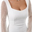 Elegant dress Perlinka is a simple, minimalist piece enhanced by beautiful long sleeves decorated with pearls. It is sheer thanks to delicate tulle and also comfortable, as it flares into a bell shape. The dress has a feminine Fit & Flare silhouette, beautifully highlighting the waist and hips, and thanks to the slit, it allows for completely effortless movement. It is stretchy and adapts wonderfully to the body. The dress fastens easily with a zipper at the back.