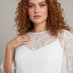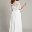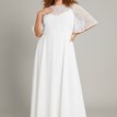 Lightweight wedding dress from the ASOS Curve collection is designed for women with beautiful fuller figures. It features a sheer bodice with a strap-lined underlayer, covered by delicately embellished mesh with short ruffled sleeves. The chiffon skirt is smooth, flowy, and gently gathered. The dress fastens with a concealed zipper, and it is truly lovely and comfortable to wear :)