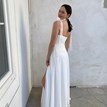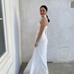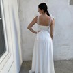 Beautiful minimalist wedding dress by the California brand Lulus features a simple strapless bodice, high waist, and a flowy 3-layer A-line skirt with a slit. A lovely detail includes two tie organza bows, which stylishly and functionally replace the straps. The dress fastens with a zipper at the back. If you're looking for a simple yet modern wedding or reception dress with a touch of flair, we recommend this white beauty.